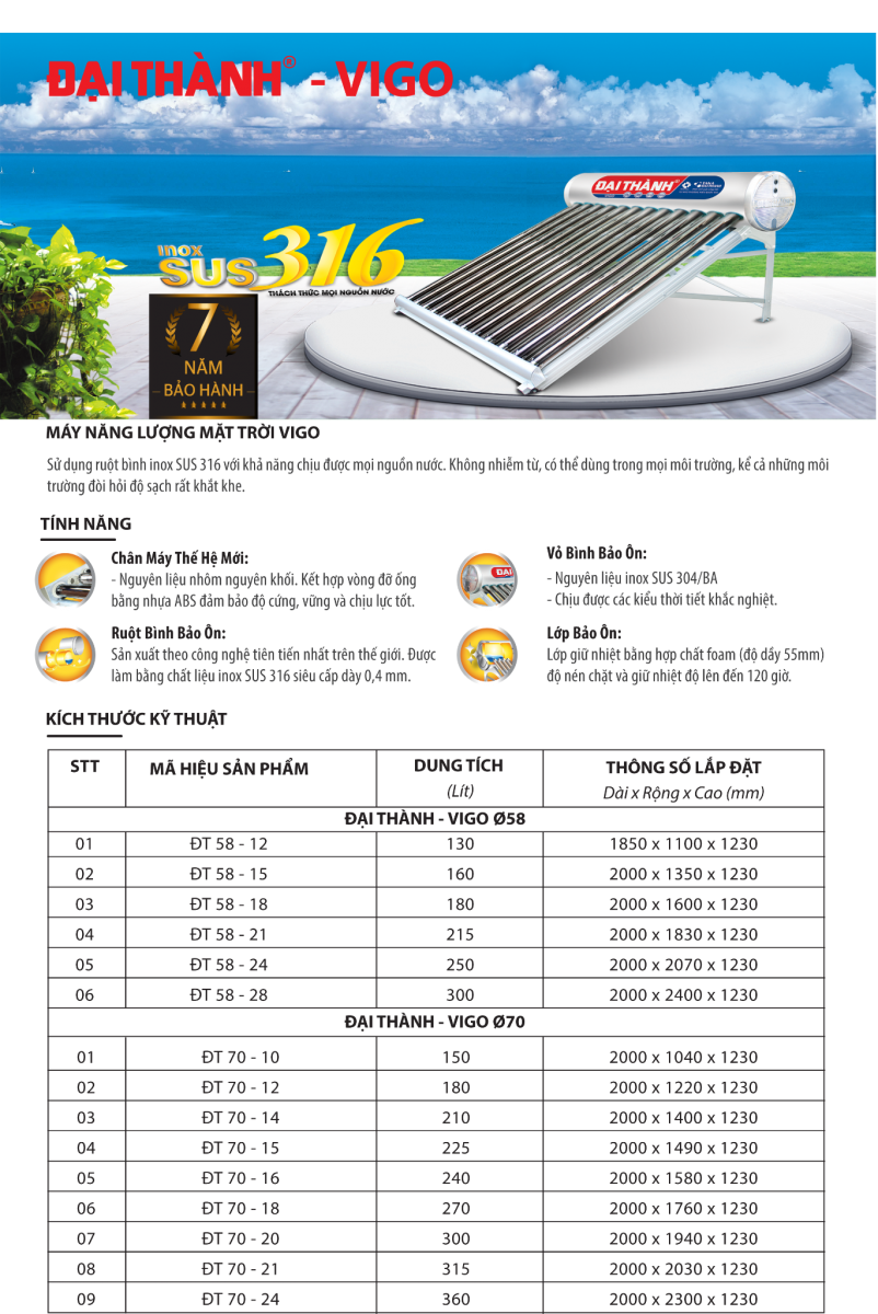 Máy Nước Nóng Năng Lượng Mặt Trời - Vigo - 210 Lít - ống Ø70 :